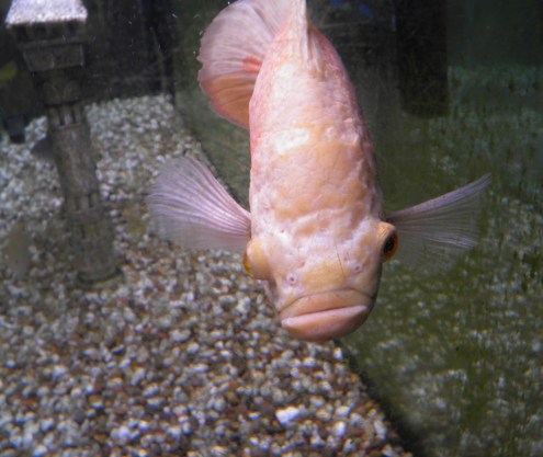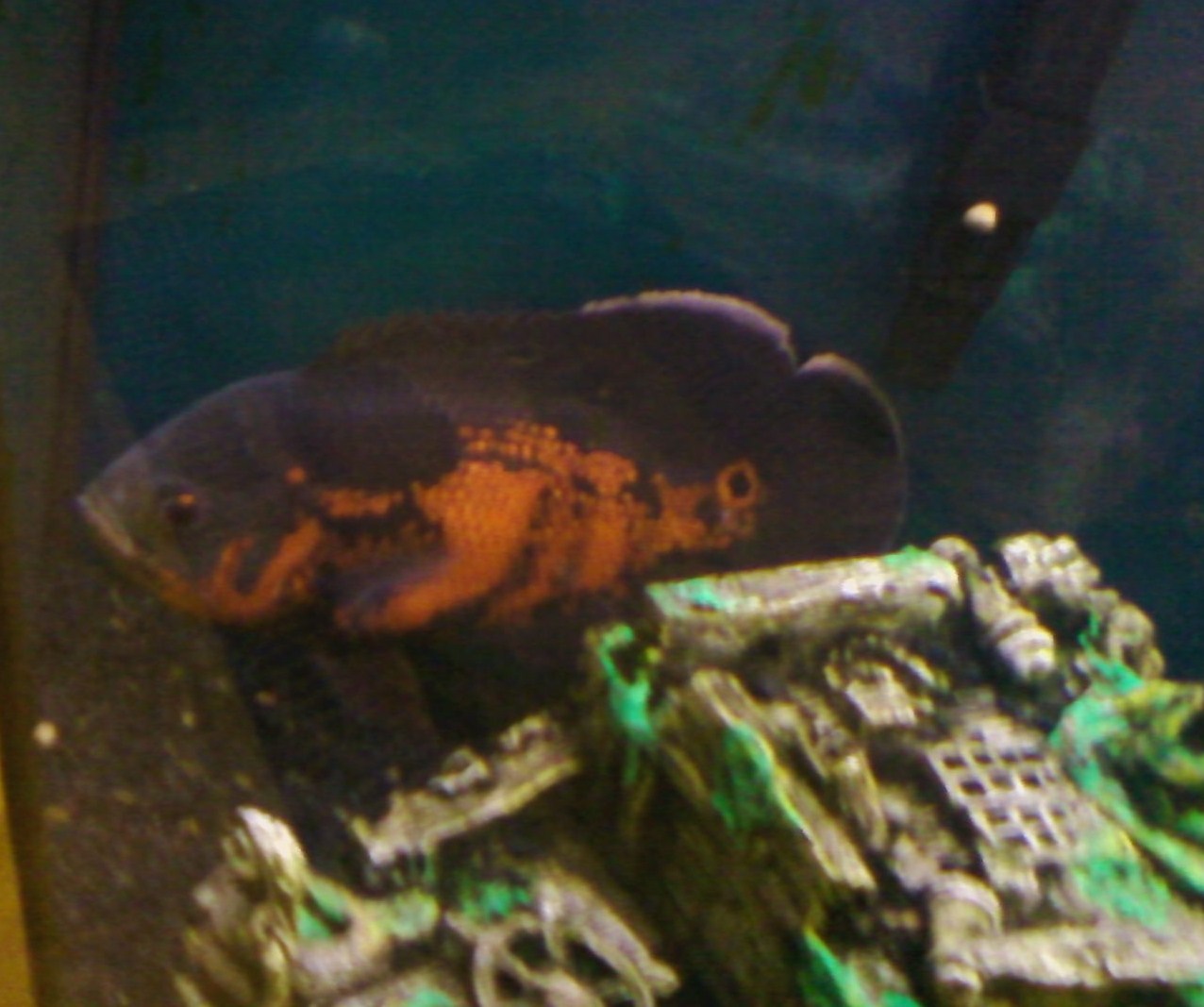 He’s not as clear as he could be, but you get the idea. He’s about 8 inches long and 5 inches top fin to bottom. In a 36 gallon bow tank and looking mean, but we’ll see.
