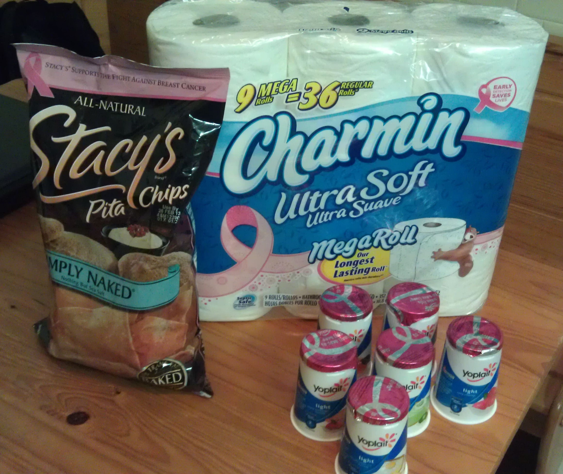 Hoo–ahh I am funny. I am cheating a little by back dating this post for Tuesday but that’s the beauty of having your own media outlet. You control what the people see. And when. Well, don’t I just sound power crazy. I’m not. I’m just trying to hurry and I want my little calendar to the right to have a blue date every day. It’s nuts how these small things can make a difference. Or not. Personal demons and neurosis aside…we went shopping and of course I took pics of all the Breast Cancer displays. People in the store were kind of looking at me, probably wondering why the hell I would be taking pictures of food shelves and cardboard stands, but that’s ok. Anyway this is product I buy. They roll out the pink packaging once a year and we go for it. Looks pretty. Now let me see if I can post this and then get another one out before I leave for work…it’s always a crapshoot. Ha. I said crap. Nice ending huh? Classy. Later.