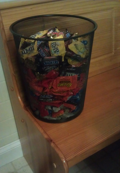 Oh candy…I almost forgot the garbage can full of candy we bought. Seriously. It’s the kind of garbage pail you would put into a bedroom or next to a desk. Ridiculous right? Too much money. Too many raw pounds of chocolate, because of course it’s all chocolate. Why would we waste our time eating leftover smarties and jolly ranchers? That’s right. We wouldn’t. Here’s to another year without cavities!