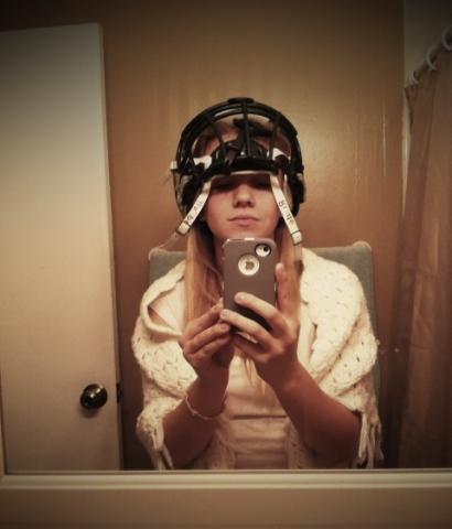 His pic. His post and Facebook status. He was very happy. The last game was actually Thursday of last week, but I am slow. The season ended with the team record of 4-5. Not a terrible finish. Too bad the last game had to be against an undefeated team. Seriously. 8-0? Man, they were good. At least we scored and didn’t get completely blown out like some of the other teams they played during the season. (Granted it was against the third string players but who cares. Points is points. Respect the pigskin.) And it was cold and windy and raining sideways for most of the afternoon. Football in the Midwest. Fun! Anyway. I just wanted to use this picture because he looks so cool and happy and thin. Now I have to keep him slim until the next sport starts in a few weeks. An indoor sport. I will keep you posted. And because I have 2 children, and my girl likes to see pictures of herself whenever possible, and she took a pretty cute picture of herself in his football helmet, I am putting it right below here. It’s not exactly a Pink October post but it will have to do for today. Later.