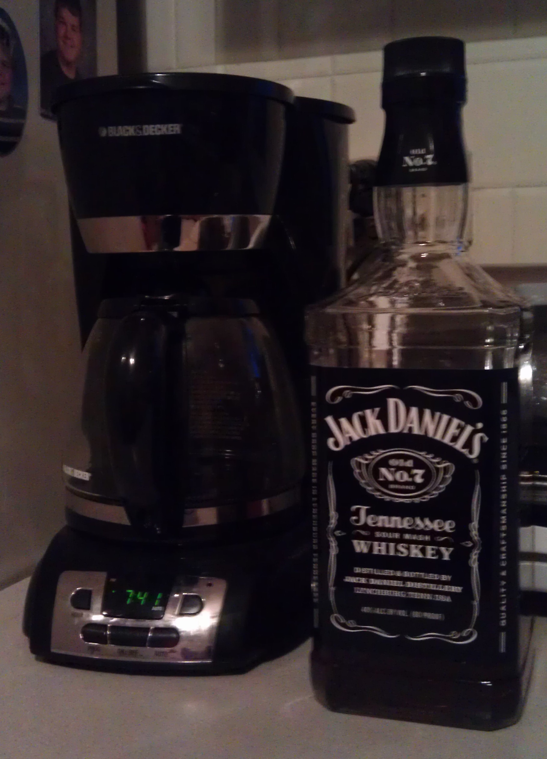 You know you need to work out when you are too weak to pick up your big bottle of booze. Real time pic using the coffee maker (12 cup/full size) for reference. Hey. Don’t judge. We didn’t start at the top. We slowly graduated up to the party version. It’s more economical. Picture proof below. Although I really shouldn’t. It’s embarrassing that we even have all these bottles (we don’t; anymore) and that we took a picture. (The BF did it. I’m just posting it because we are immature.) It’s a nice shot though huh? Super sharp and clear. His new phone takes really good pictures. I’m so jelly. Later.