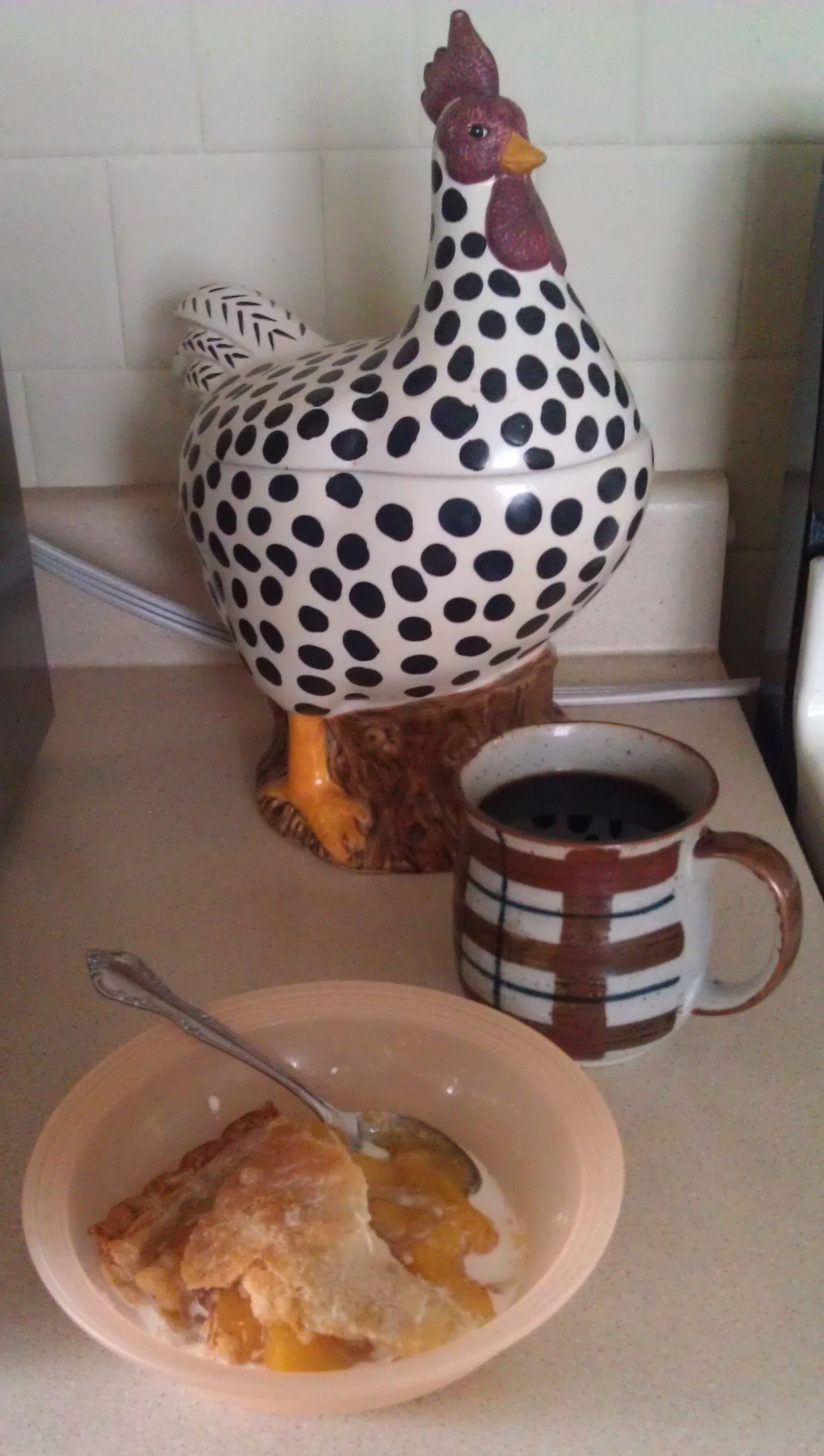 I Call It: Warm Peach Pie Draped In Cool White Cream And Hot Black Coffee On Rainy Grey Day; With Spotted Chicken.