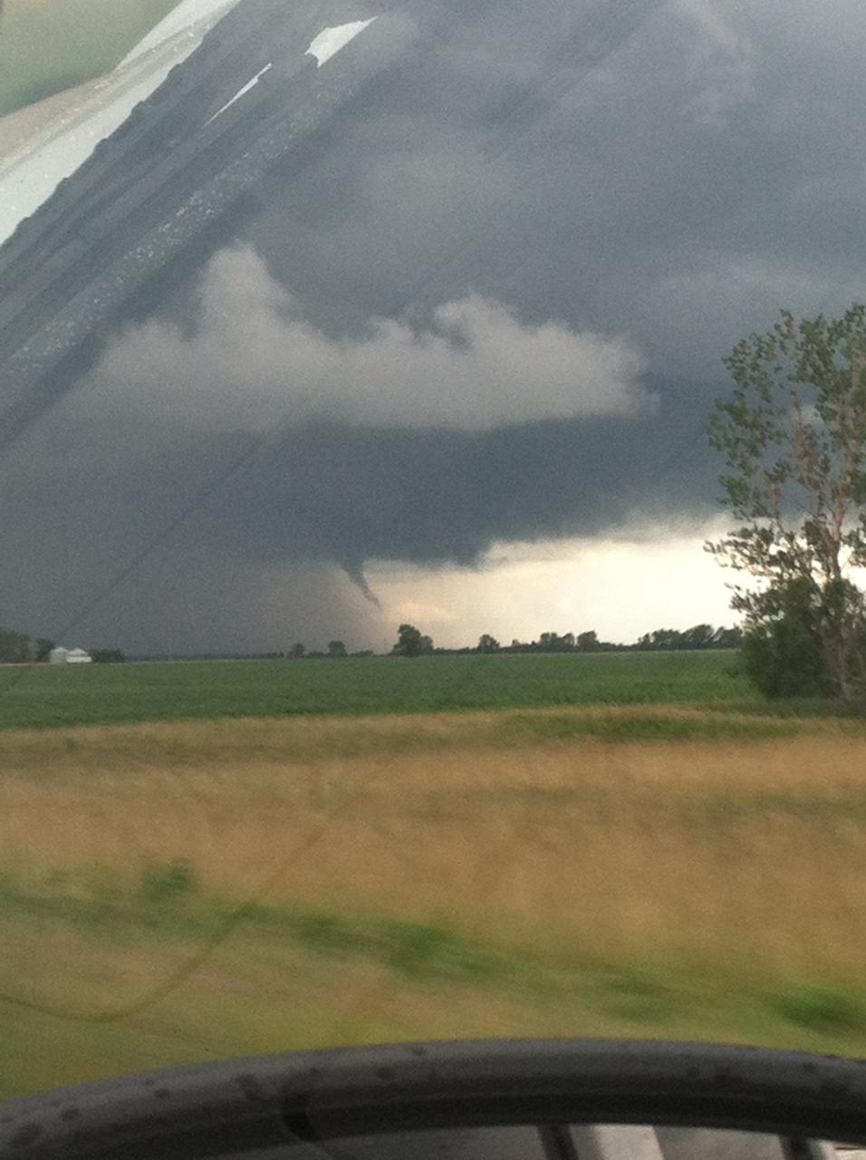 This was about 2 pm, Saturday, driving down, what I assume to be, I57, near the town of Mattoon. The kids are on their way to grandma’s with their dad. No one confirmed location for me, but the fastest way south is 57 from here. My daughter took this picture while it was happening. It’s a really good picture. Especially from a moving vehicle. She said it was only a funnel cloud when they saw it and she got a picture of it going back up. But I like this one. Very impressive. Then it hailed and rained so hard they couldn’t see and then it cleared. She texted, word for word, “It’s done now. Clear as a bell perfect now!” She sent a picture of the blind windshield but it’s just a grey square that kind of looks like smeary, foggy rain. This is the next picture she sent: