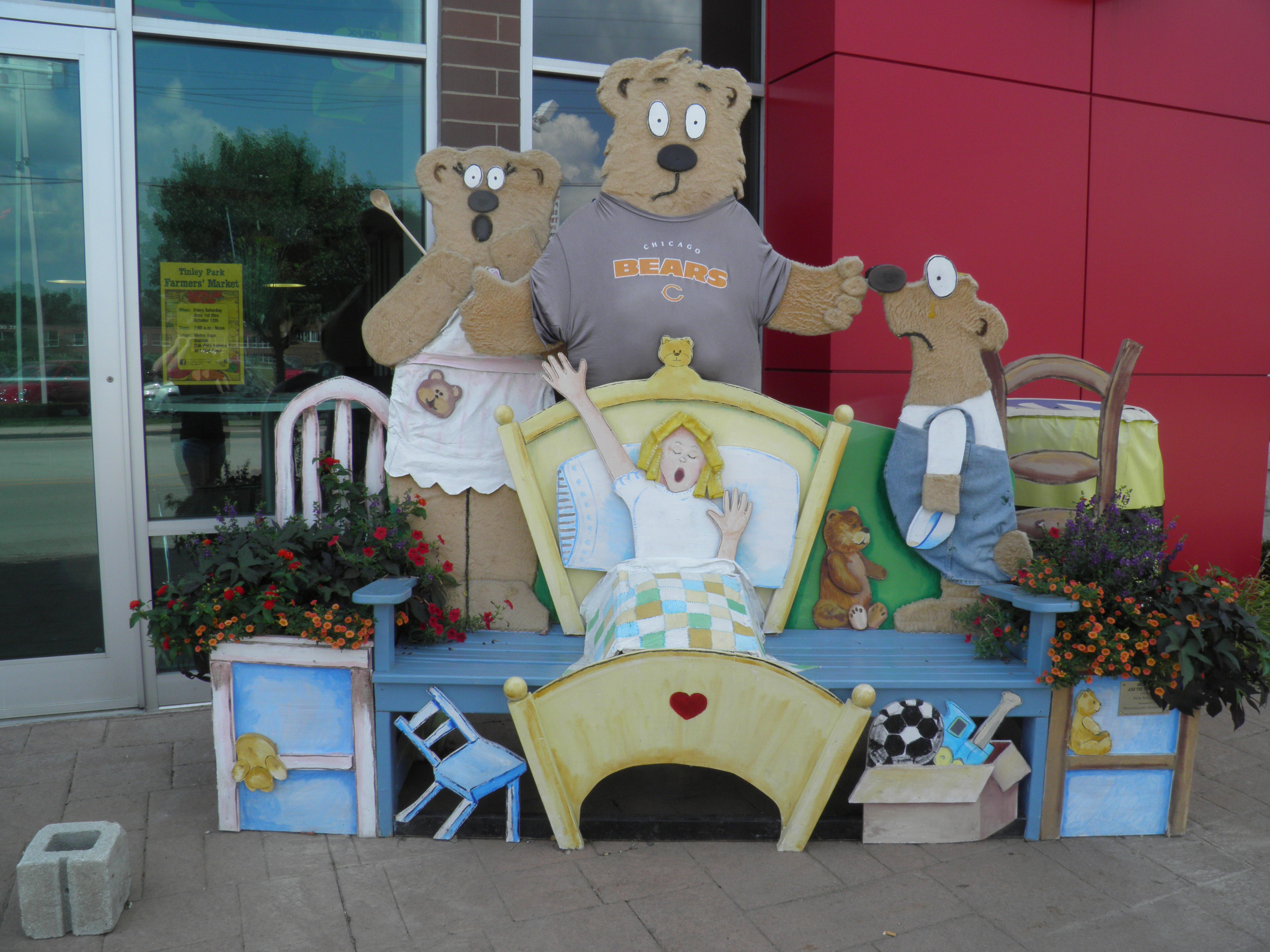 How about I just post the pictures in the order that I took them? I can not believe, no, scratch that, of course I can believe how much brain time I devoted to this issue of how and what order to post these benches in. Who cares? Doesn’t matter. We didn’t walk in any particular order. They are not arranged in any particular order. (I don’t think anyway). So what difference does it make how you see them? It’s all the same theme. My head hurts. And it doesn’t even have to. Oh well. The other post had the dragon bench. This is, above, Thumbelina’s Garden. Pretty sure. Below is, Goldilocks and the Three Bears. That makes 3 posted.