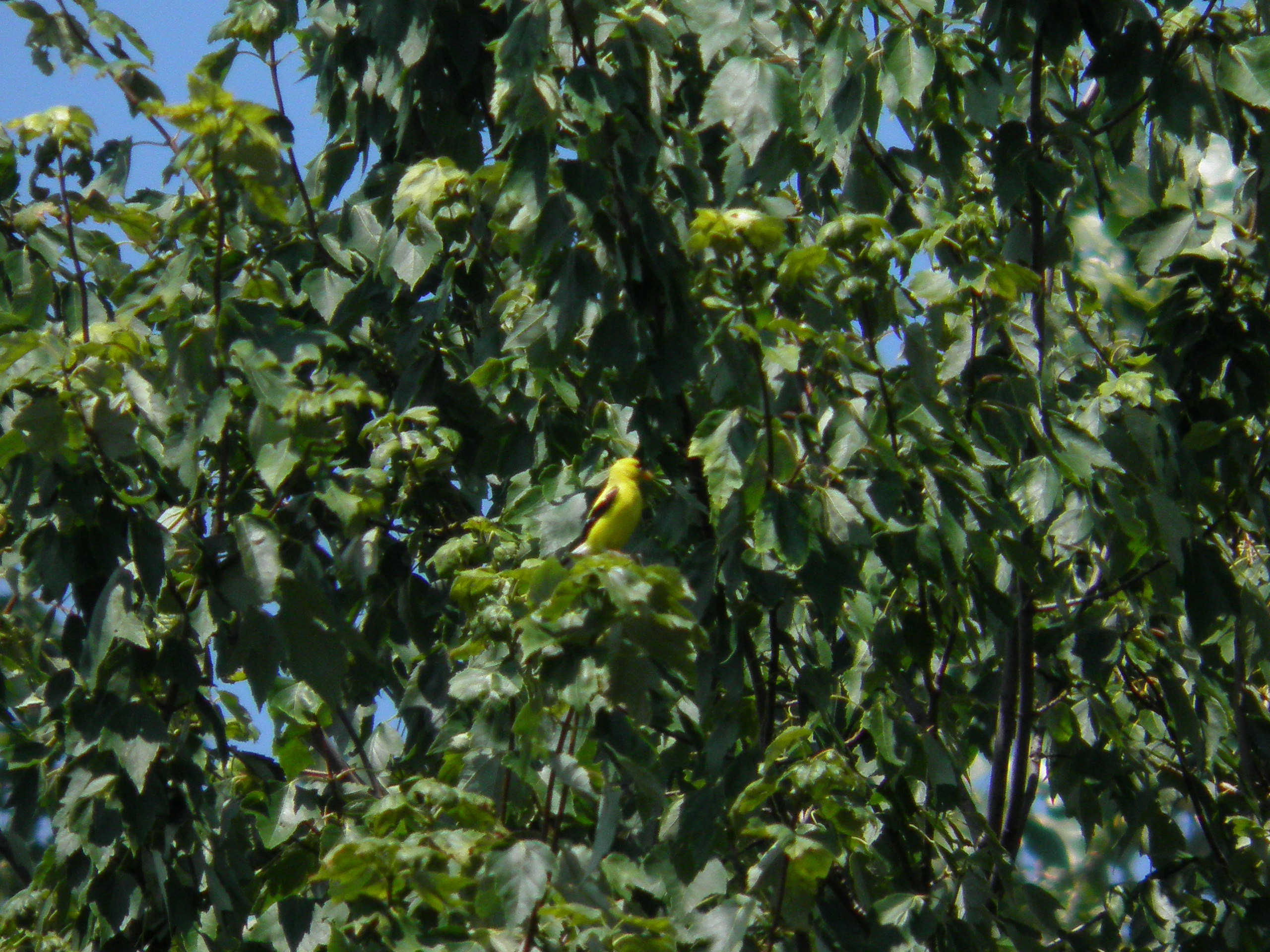 Yellow Goldfinch. If you look in the middle of the picture. These birds hardly ever come and pose right in front of me. So annoying.