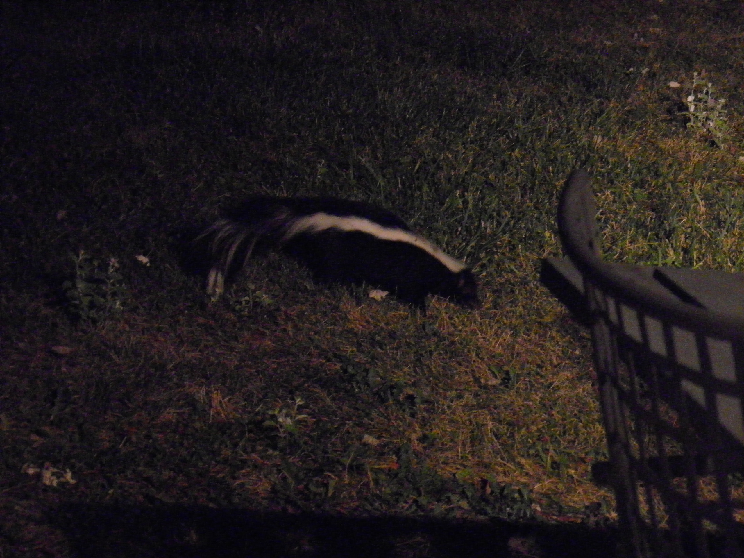 Skunk. There was actually 2. It looked like a mom (?) and her baby (?) skunk. They were just eating any and all the leftover crap I throw out there because I know that the wildlife comes. Usually the raccoons crawl into our garbage can and dig out what they want and leave a mess, so I try to save them the hassle. The garbage can is one of those tall, basic, flip-top carts, that almost every city in America now uses for garbage per the town they live in, be it brown, blue, green, etc. In fact, I have a picture of a small raccoon that got stuck in the garbage can, at the bottom, because it was too small to reach and be able to crawl back out. Or too weak to push up the lid once it was in. I will try and get that up next. Prob tomorrow though. Work again. Poo. The same night this skunk was around we also had an opossum. But it ran away when I tried to take the picture. The skunks, literally, do not care. They will just stay there until you make a very loud noise, and even then, they kind of look up and wait a minute, to see if you are really serious, before they lift their tail and waddle towards the back weeds. Brave. They know they have the stink power. No one is going to go rushing up on that. Let me end this now with my last picture of the beautiful hawk that I got as close to as I could before it lifted off the ground and flew away. It was really looking at me. It definitely has that bad-ass-predator-air about it. It knows too, there was no way I was going to try and hurt it. It was sizing me up and dismissing me while I stood there taking the same picture over and over. Actual wild nature can make a gal feel pretty small in a big world. But happy to be a part of it. Every one have a great day! Later.
