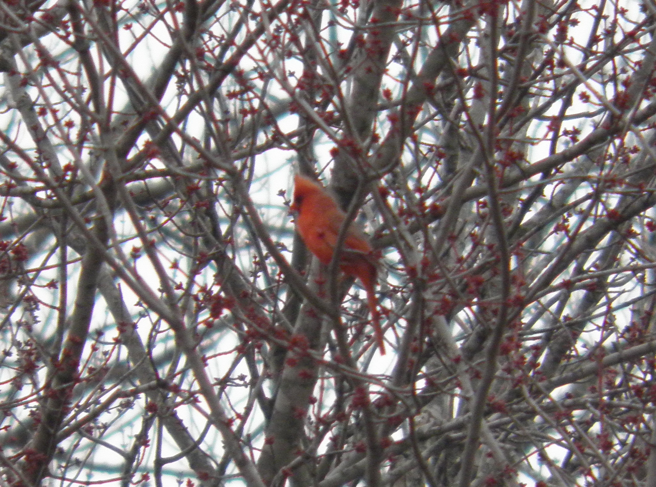 Obviously that’s a cardinal. Don’t be fooled by the grey sky behind this happy little fellow. It was warm that day. It was warm yesterday. 71 degrees. It’s supposed to be warm today. I filled the bird feeder lighthouse and the birds have found it again. So get ready internet world! More bird pictures are this close for scrolling down this website after a long cold winter of just snow and icicle pictures. And not to disappoint, below is the first picture of my daffodils, also making their debut Spring 2014 appearance. Enjoy.