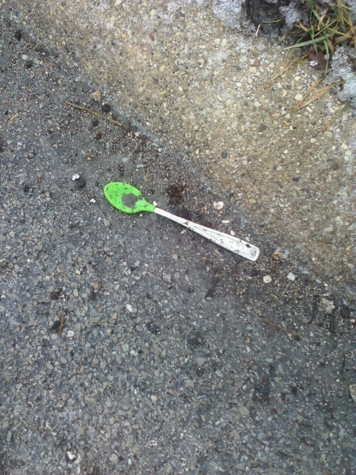 I am not sure how spoons get into the street. Garbage maybe? Fall out of a bag as the child is being transported? I can’t even guess and maybe it had quite a journey to get where it is right now. If you have any ideas, leave a comment, I’d be interested in hearing other theories and possibly strange utensils laying in the street where you live.