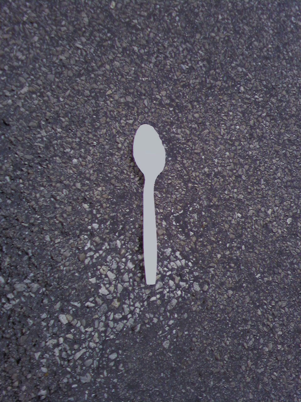 Last picture. It's another spoon. The detail kind of got washed out by the color, but it's your basic, plastic, white, disposable spoon. This is the second spoon on the street in two weeks. I'm smelling a trend (and a new feature for me) Later in the day, this same spoon was crushed to pieces, still laying in the street, most likely run over by many cars. Sob. 😦