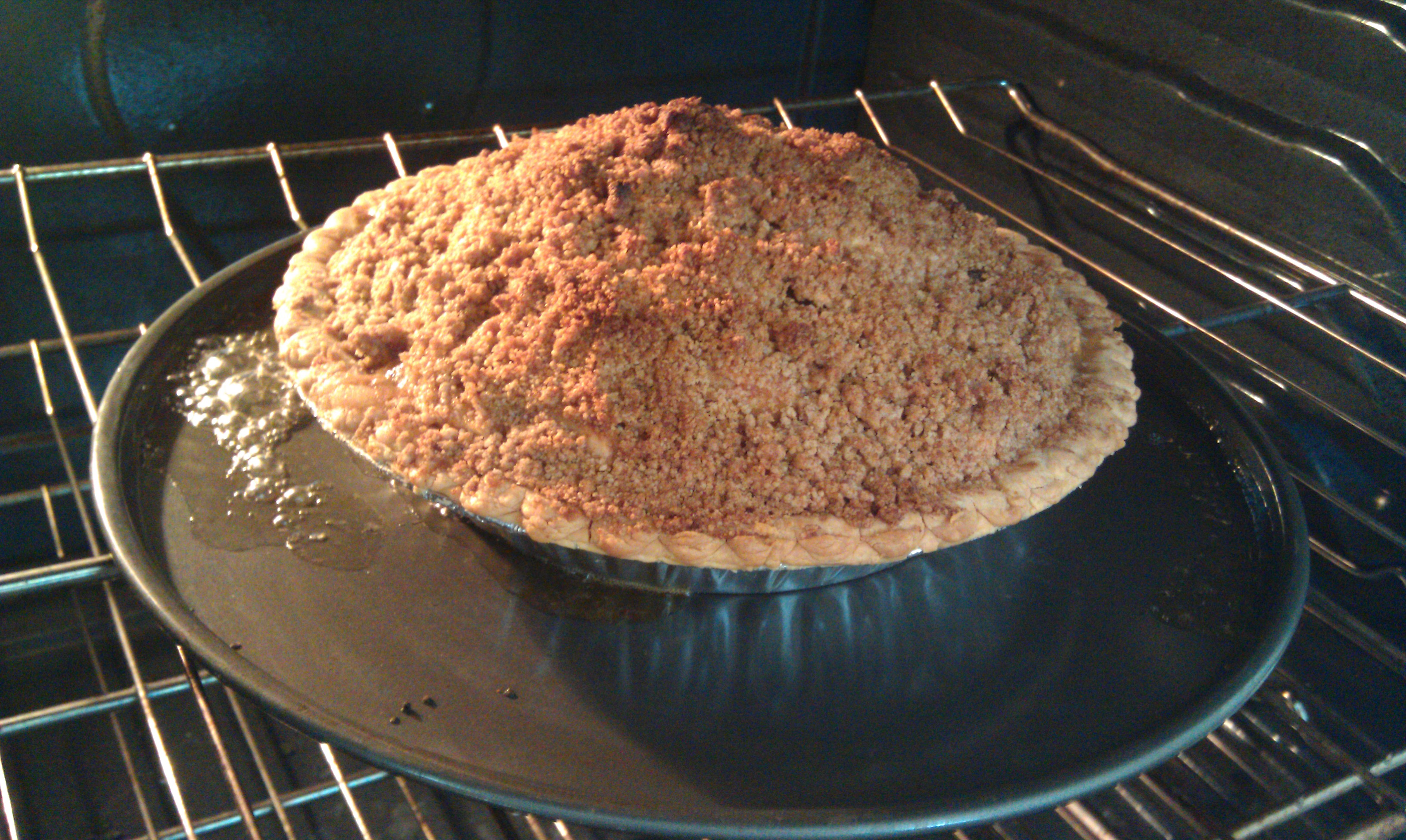 Apple Pie! My first apple pie in many years. We will see. Juices are supposed to be bubbling and it’s done. That would be a crumby streusel type topping. It tastes good. I already tried it. Now hopefully the apples will be soft and sweet and the inside will not be runny!