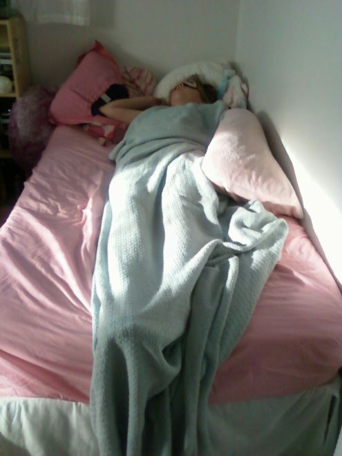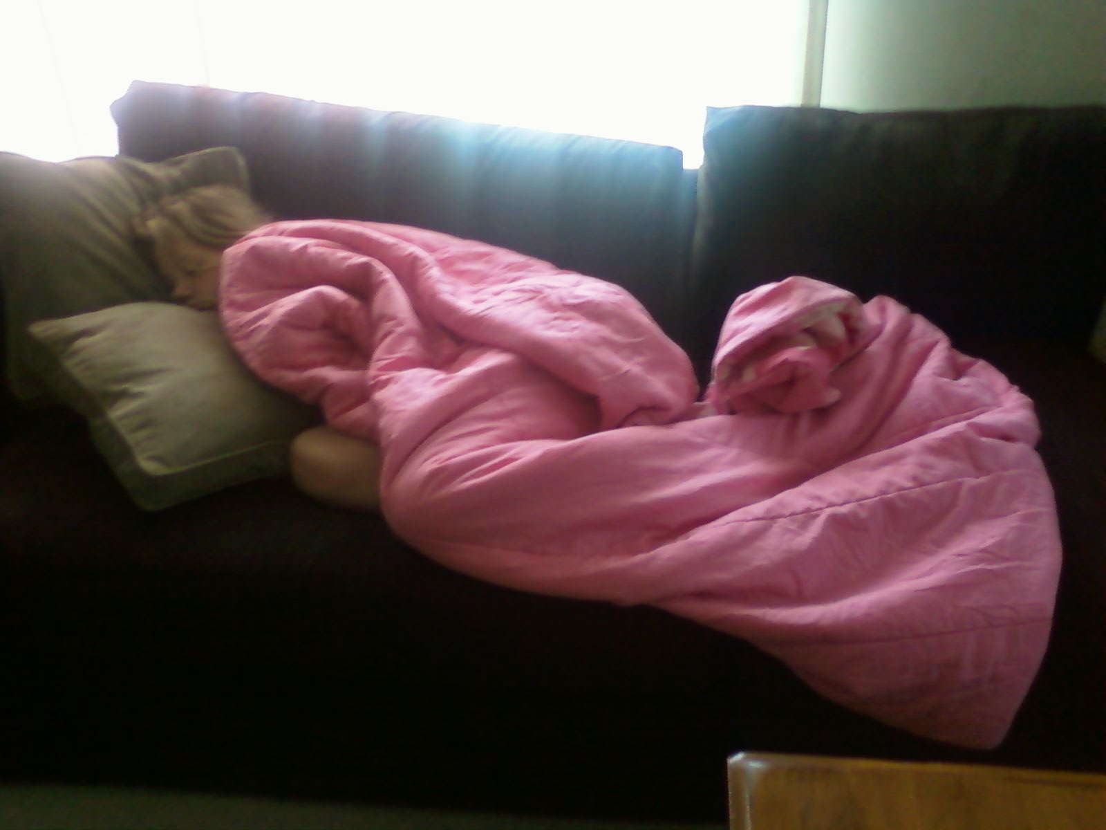 Here’s a pic after I woke her up at 8 am. I know, I am a MONSTER! She managed to make it all the way to the couch. At least she was out of her bed. That’s half the battle.