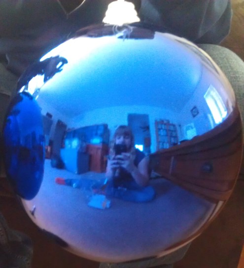 Going with a blue theme. And continuing with the “people reflected in ornaments/windows/etc..” theme. That’s Stevie. I am still trying to take down the decorations, so I have to use up the rest of these holiday themed pictures. I figure I can push it another week and that’s really it. Also, I meant to update the weather yesterday because I know my cousins depend on me to fill this internet space, and their valuable time, with information they can easily get by walking outside. Plus it’s been real nice. Like unseasonably nice. So nice that there is talk now of: “THE HORRIBLE WEATHER TO COME!!” Dun dun dun. We love predicting blizzards and snowfall that will be higher than our houses. Eh. I say it’s fine. It’s not really a matter of, one month of nice equals 3 months of crappy. It all depends on the winds and the atmosphere and the isotopes and all that meteorological stuff. If the world wants to warm up and top off right about here, I’m good with it. I’ll take rain and wind over white-outs and sleet any day. Anyway, it was a balmy 45 in the daytime yesterday and dropped to about 33 or so by night. It was very windy but I thought it felt kind of good. So imagine my surprise this morning when it was snowing! And some even stuck to the grass! Right now, at 5 pm, Monday, it’s cold. Not ridiculous cold, 23 degrees, (which I guess is pretty cold actually), but it’s not snowing. And it’s not too windy so it feels ok. Besides, I hear 50 degrees is on the way again by the end of the week. Yay! Global warming!