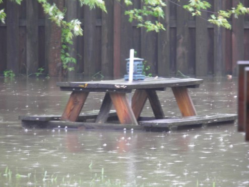 This is not actually MY yard. It’s my sissy’s. Every time it rains for more than 10 minutes her backyard turns into a pool. It flows fast and right on out to the street and down the block, but still, what a pain. I have more pictures of the whole yard full that I will post randomly because I am still safe here on my hill. But they say the rain is coming. We are already at saturation stage. I wonder where all that water ends up going? Hmm.