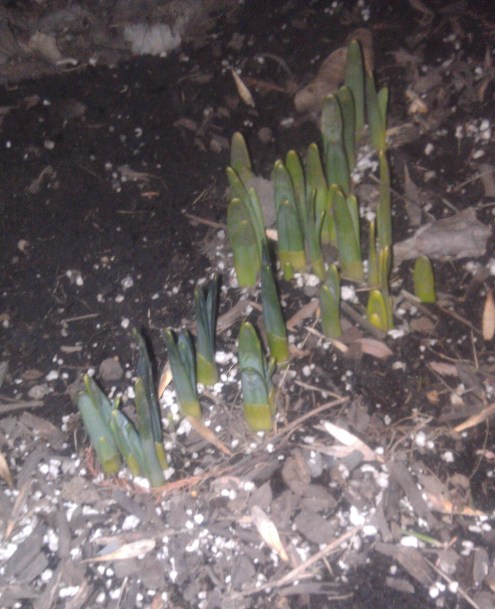I know it’s not February first yet, but according to the air temperature it’s like a whole new season. We need to come up with some kind of phrase to identify this trend in unusual, possibly alarming, weather system changes. I can do 50 degrees all “winter”. I’ll even take the occasional one day snow storm followed by three days of melt. However my little daffodil buds are getting confused. Here’s a picture of them looking sad and sort of green-yellow in the grey and dirty dirt. The ground is not ready for them to sprout yet, but the heat says, “Come on up! The air is fine!” But it’s not.