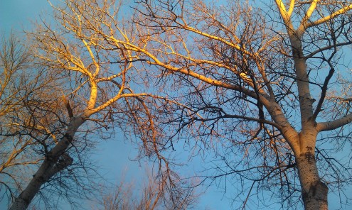 I’m about to go get some food with the family and have a margarita. Just one. And it will be small. Well, smaller. We have an awesome place very close by. And I checked my med info. Moderate alcohol is ok. One drink every week or two will probably be just fine. And FYI, in case you were wondering, I have my next doc appt. this week to check on those meds, and even though it seems unlikely, I really think I feel better. Like, not sick feeling. Clear headed and without any throbbing or eye and temple pain. Maybe that BP was killing me. Sometimes drinking the kool-aid isn’t always a death sentence. Hard lesson to learn. In just a few days, I have tried to overhaul my sodium intake and step up the exercise regimen. We, me, everything, that you eat for convenience or that comes in a processed package is LOADED with mg’s and mg’s of that sneaky sodium. I spent my last few days buying some snazzy new jeans and t-shirts to transition myself slim again. Thanks to the new spandex and technologically advanced textile manufacturing, my jean size didn’t change! And no one will ever see the tags that say “high stretch fabric” or “extreme tensile strength materials”. Those labels are on a big old garbage truck heading for the dump. And I purposely shopped for colorful fruits and vegetables today. I think I shall be more boring to hang out with, but, I shall be hanging out a lot longer. Alright, one more picture because I like to take pictures of the skeleton trees. Later.