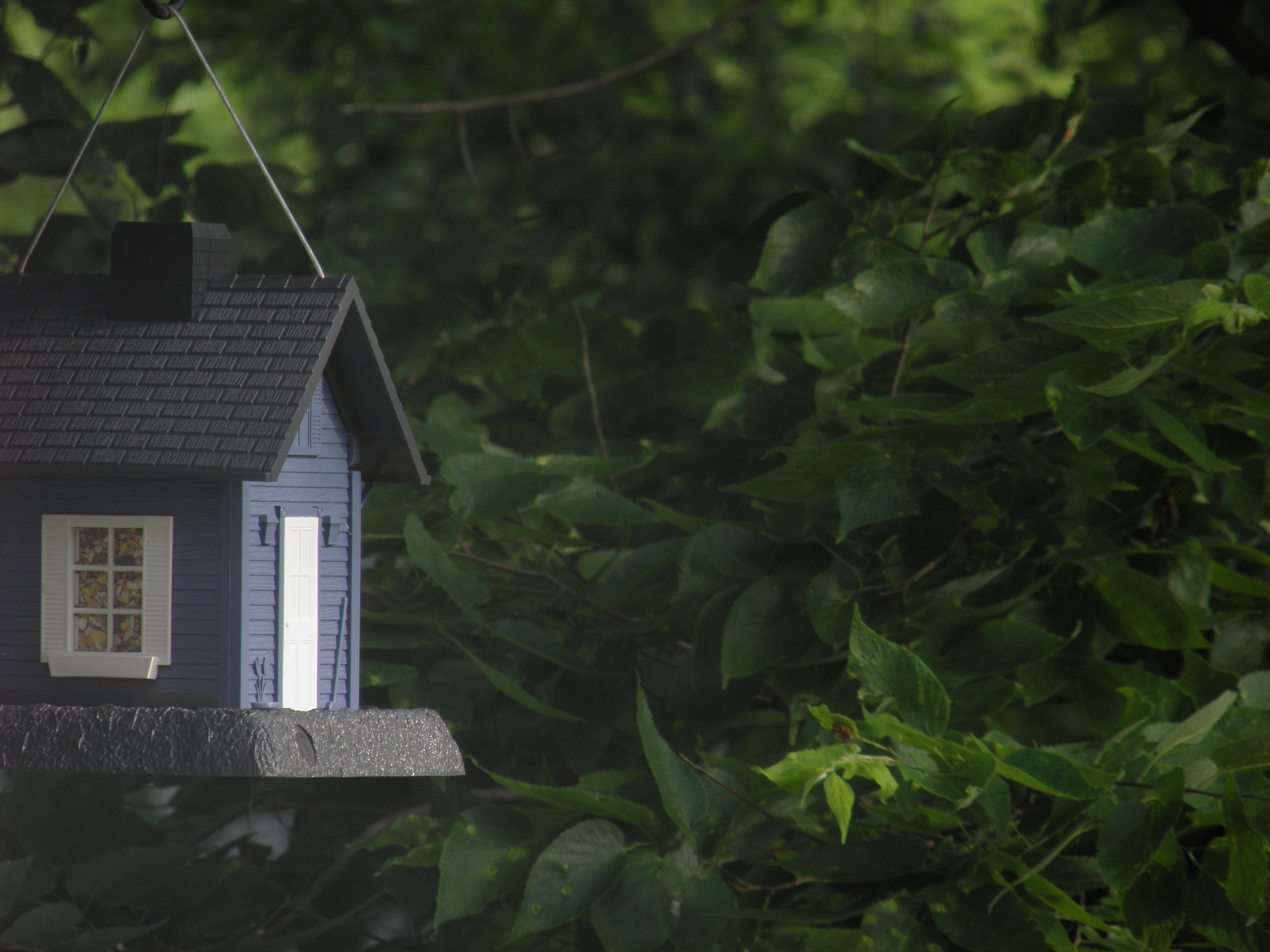 That’s from the front because you can see how high he really is. I thought it was an interesting view that you would like too. The tree is, was, tall. Tapered. Flimsy to me. I’m not crawling up there. Ken is in the middle of the picture. In the tree. Directly above the peak of the house. Here’s another look.